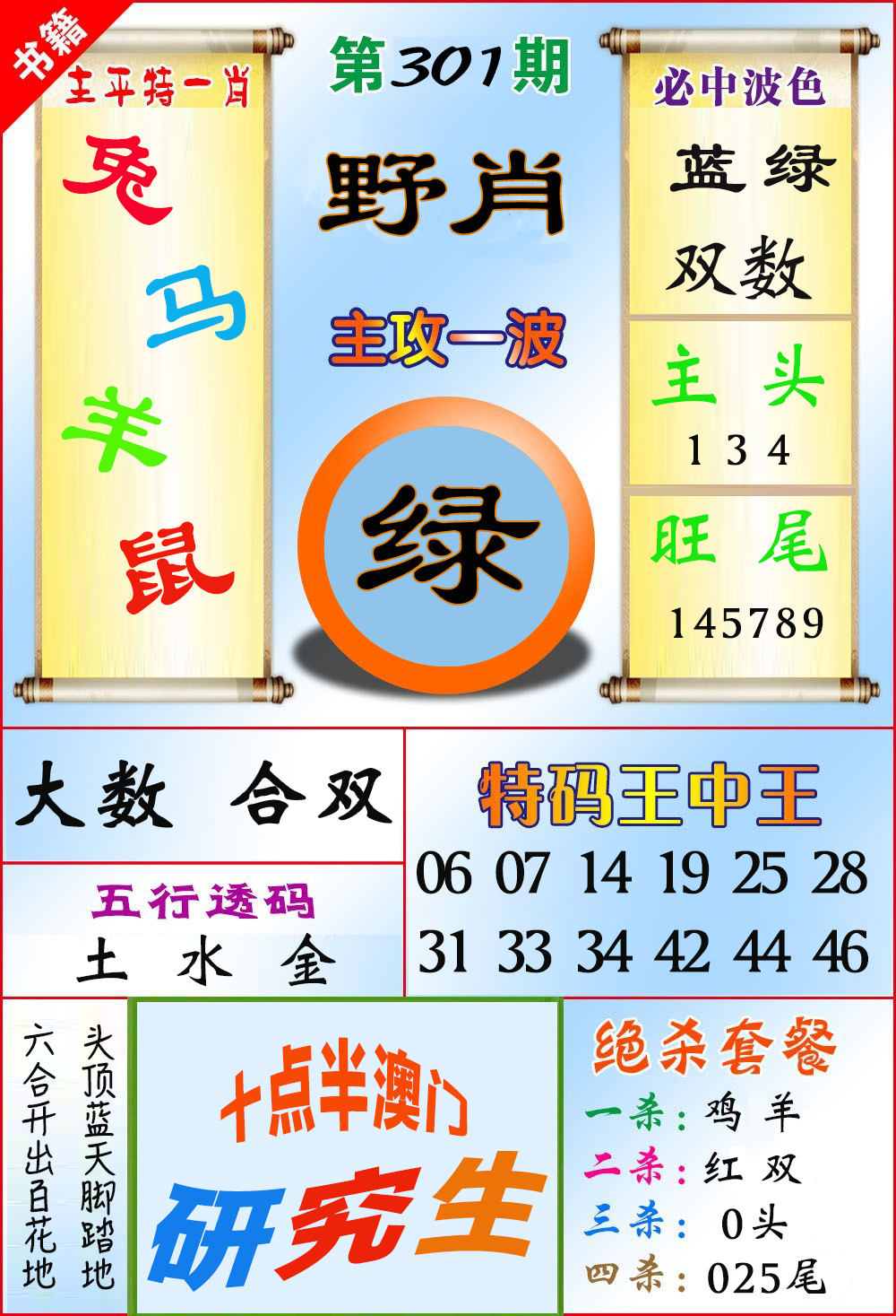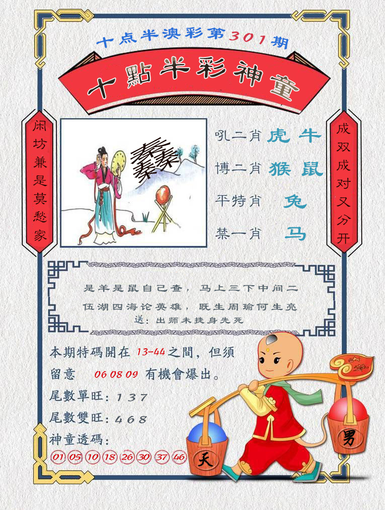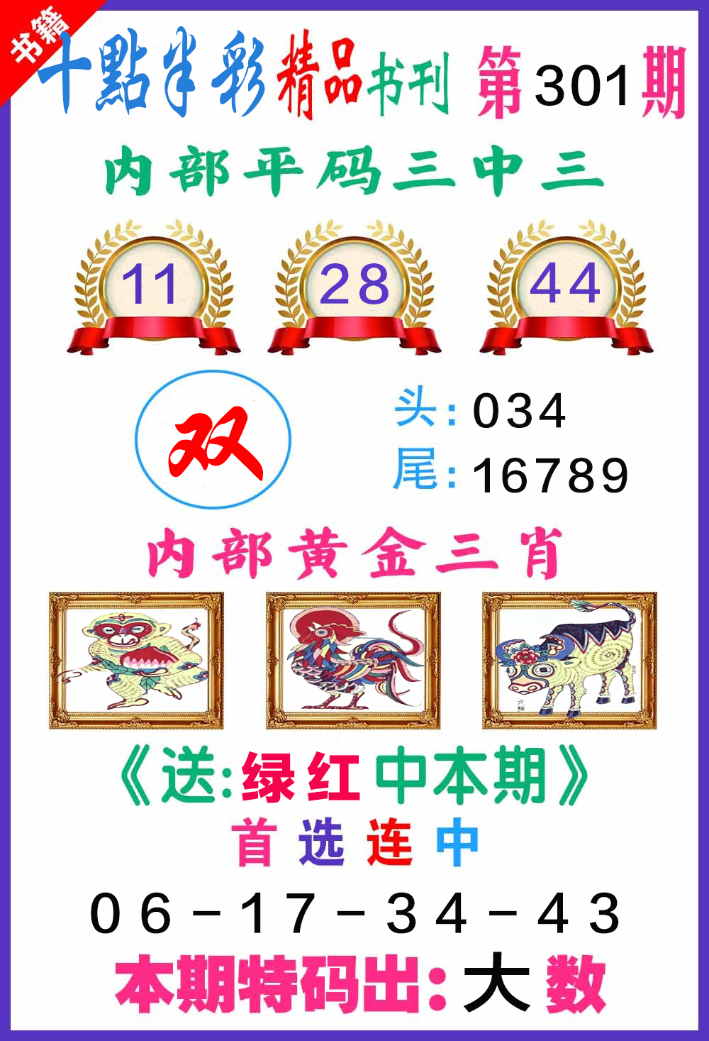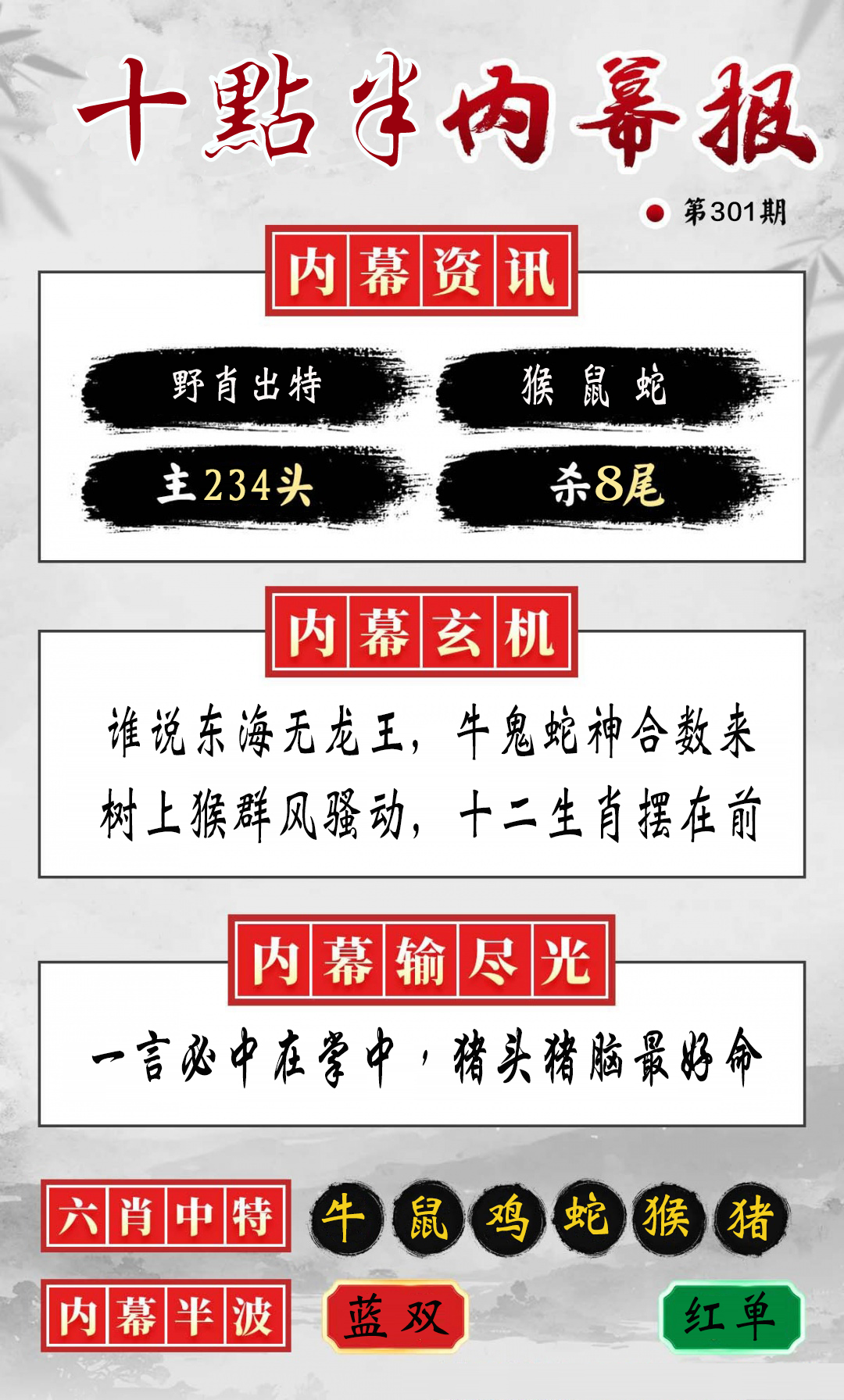 | 必中五肖:鸡兔牛猴蛇 | |